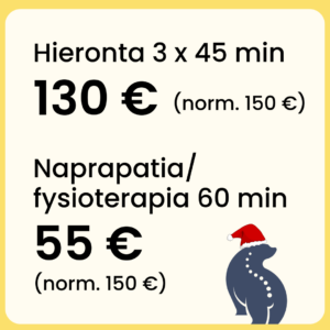 Nappaa jouluksi pukinkonttiin hyvän olon lahjakortit! Hierontaa 3 x 45 min vain 130 € tai 60 min naprapatia tai fysioterapia vain 55 €! Tarjous on voimassa 23.12.2025 asti.